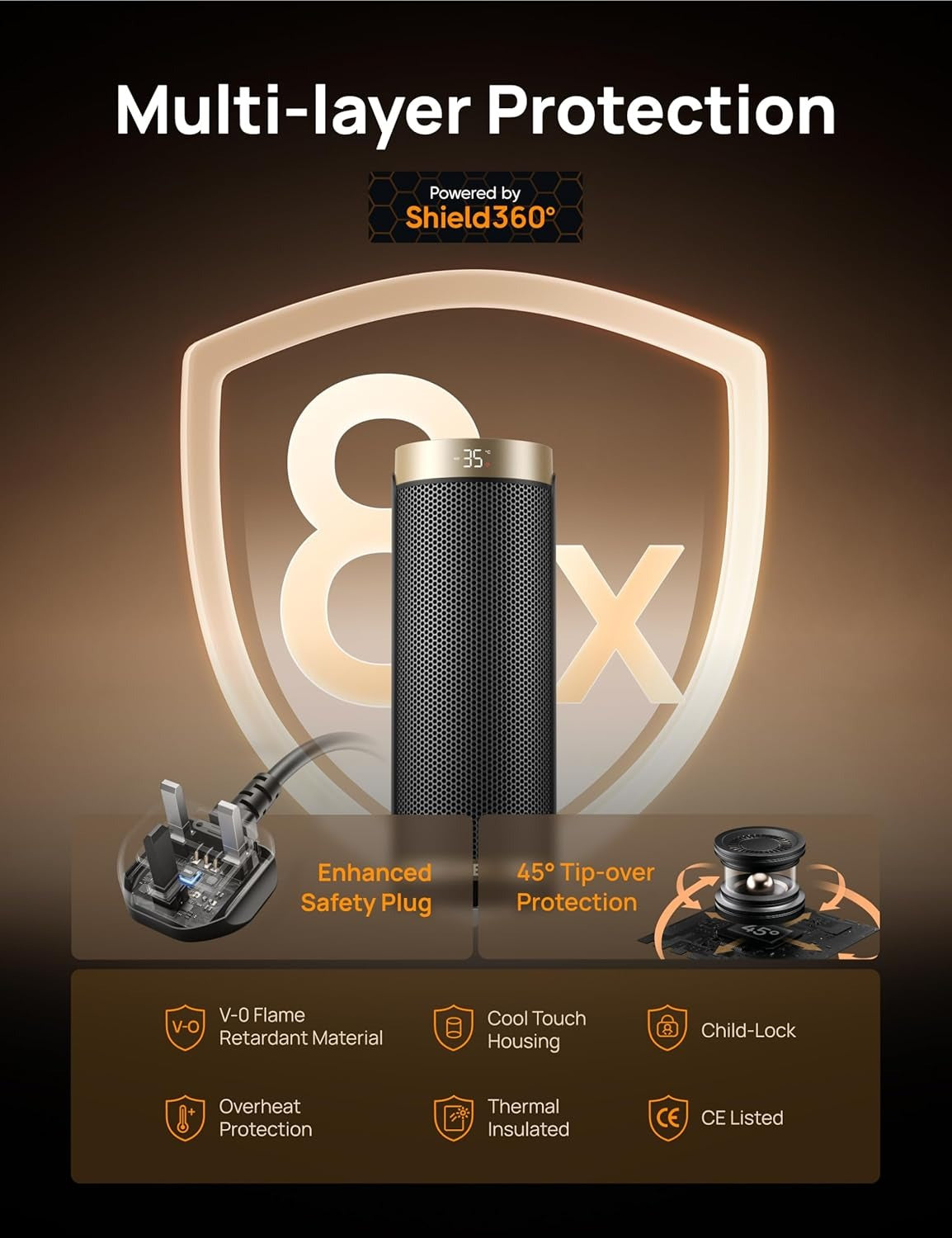 Multiple Safety Features – Tip-over and overheat protection, flame-retardant materials, 12H timer, 24H automatic shut-off